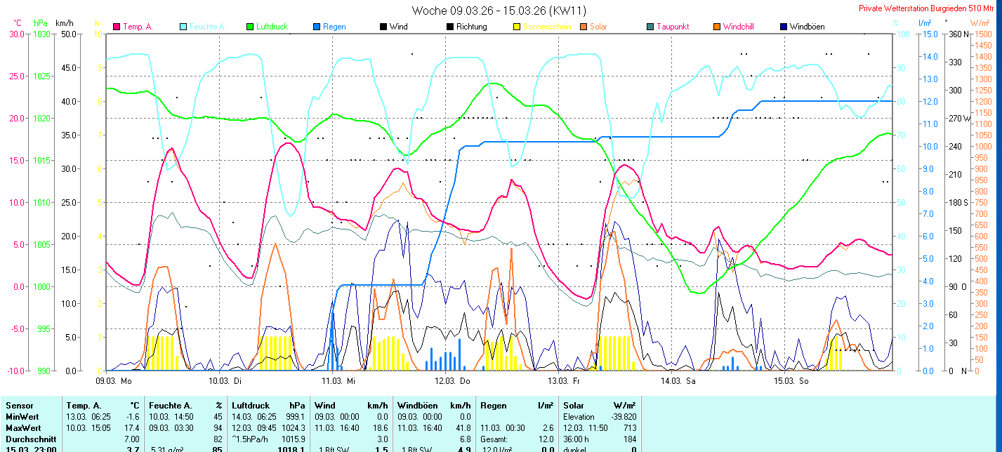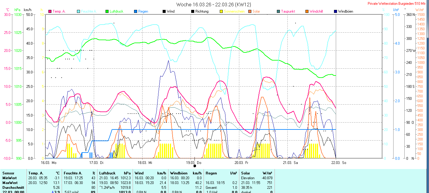 | Die dargestellten Werte repräsentieren die Daten der letzten 24 Stunden! Der Luftdruck ist auf Meereshöhe bezogen! |